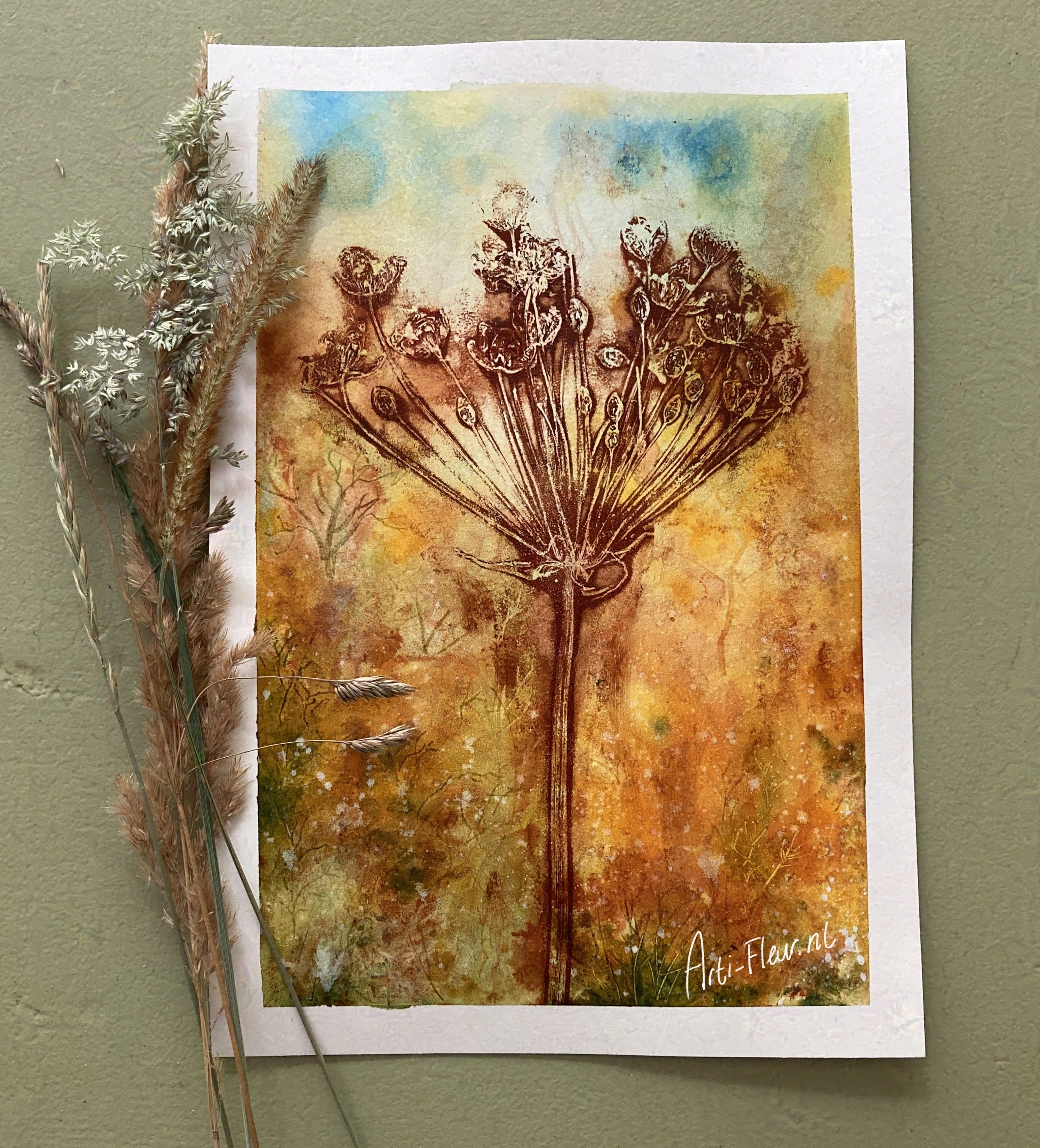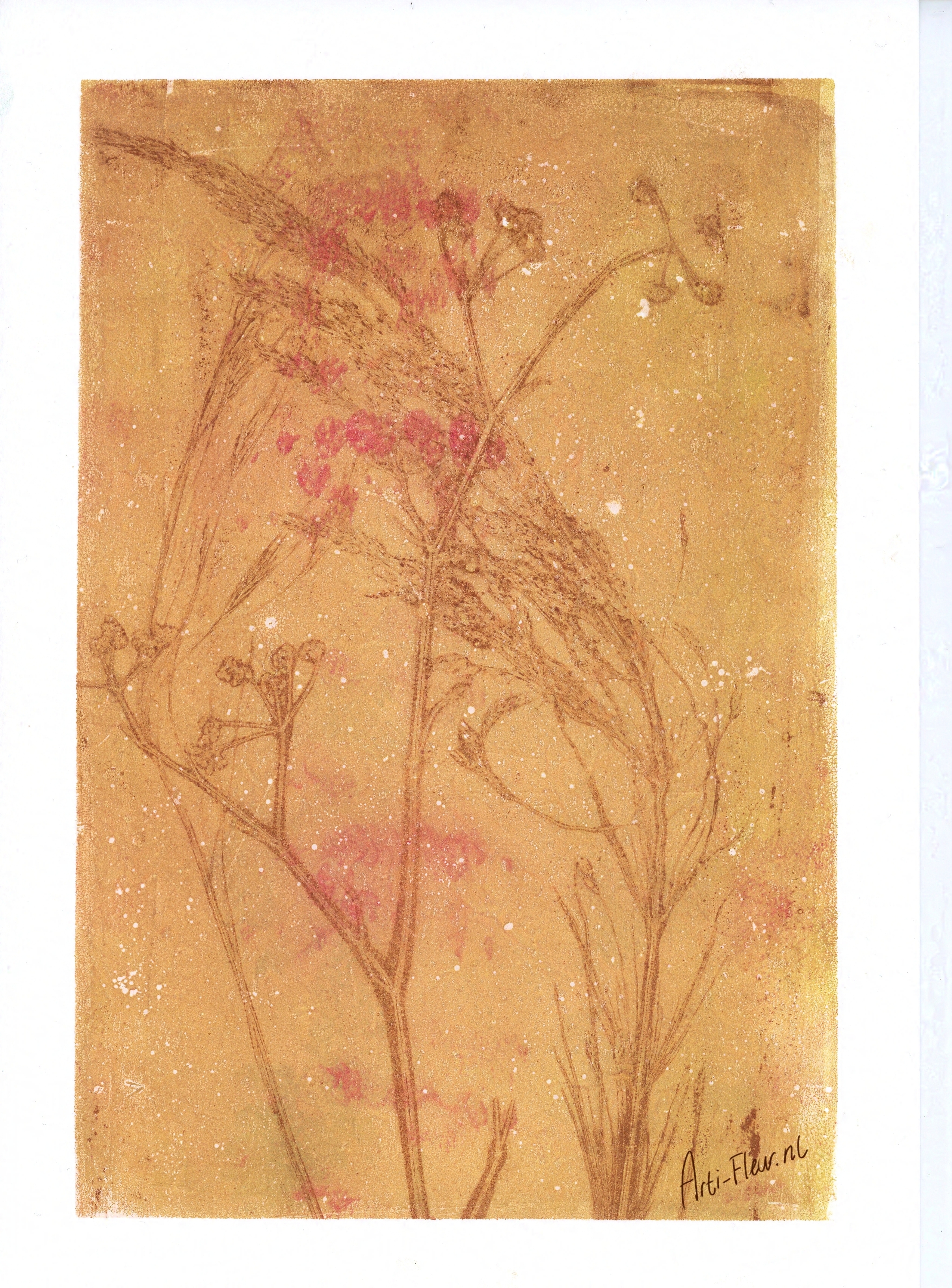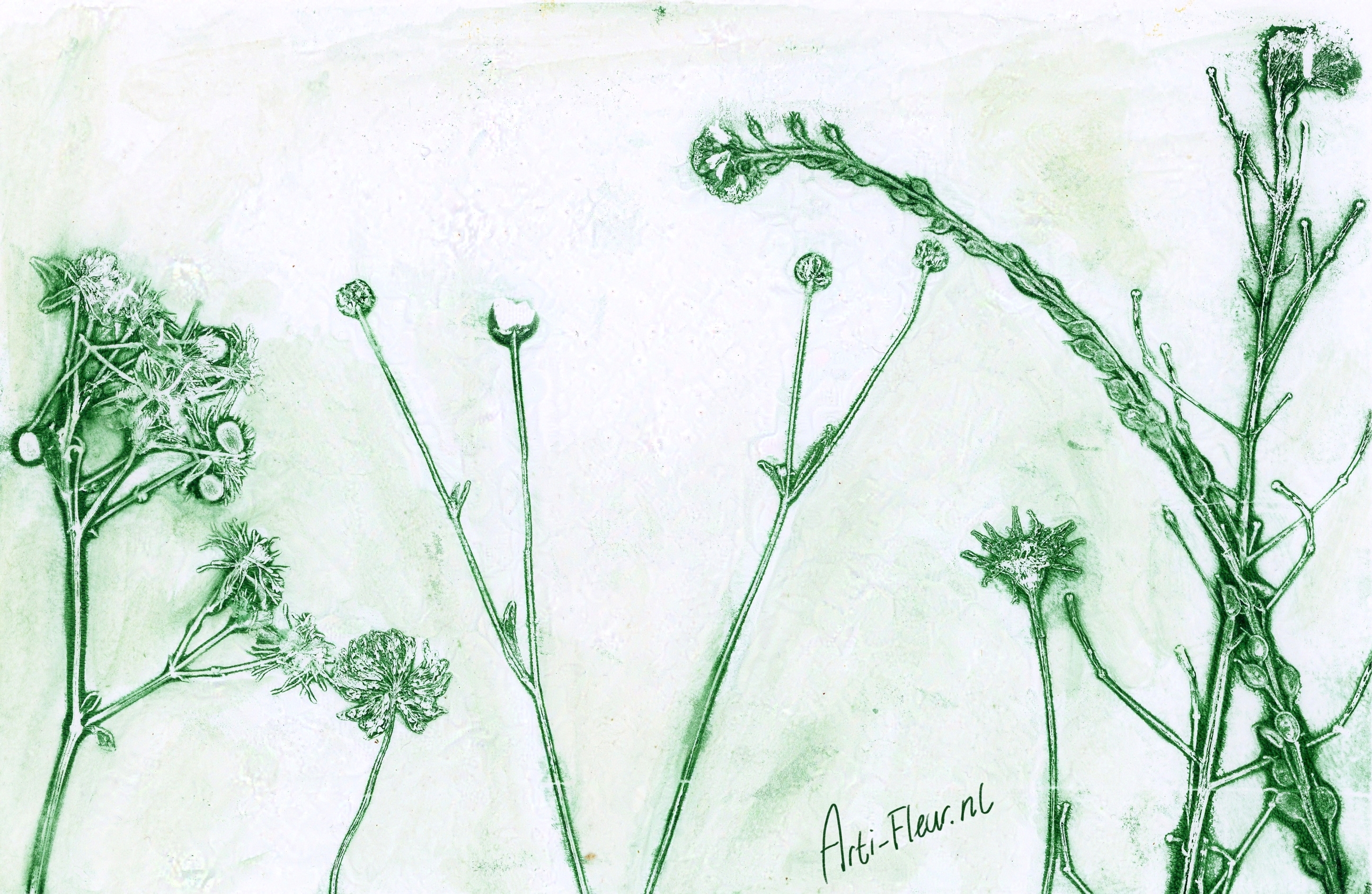 Three years ago, in addition to my illustrative work, I also started to make a lot of art with nature as a great inspiration but also as a medium in the work. I make stamps in the shape of plants, but I also make monoprints with prints of plants themselves for example. I often finish such a work by drawing or painting in it.