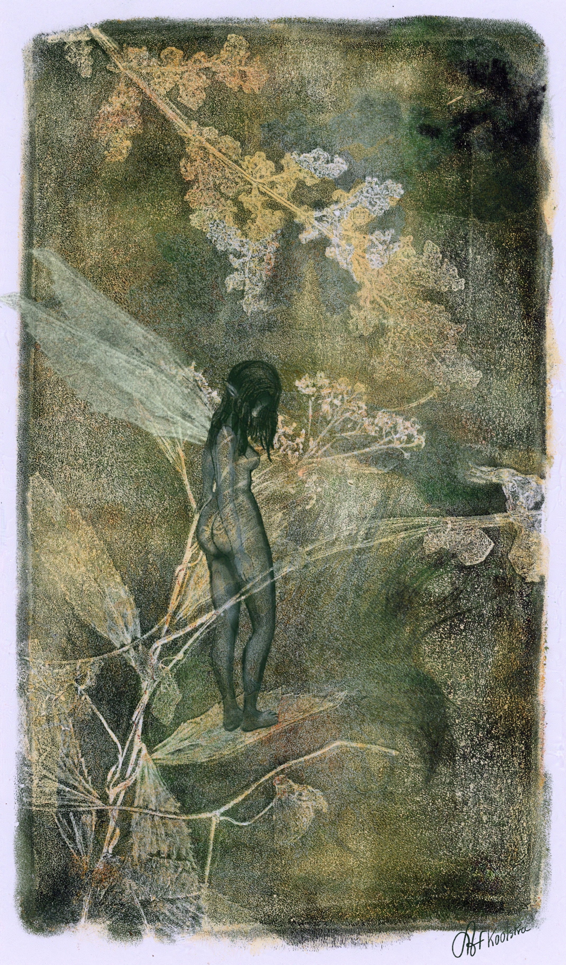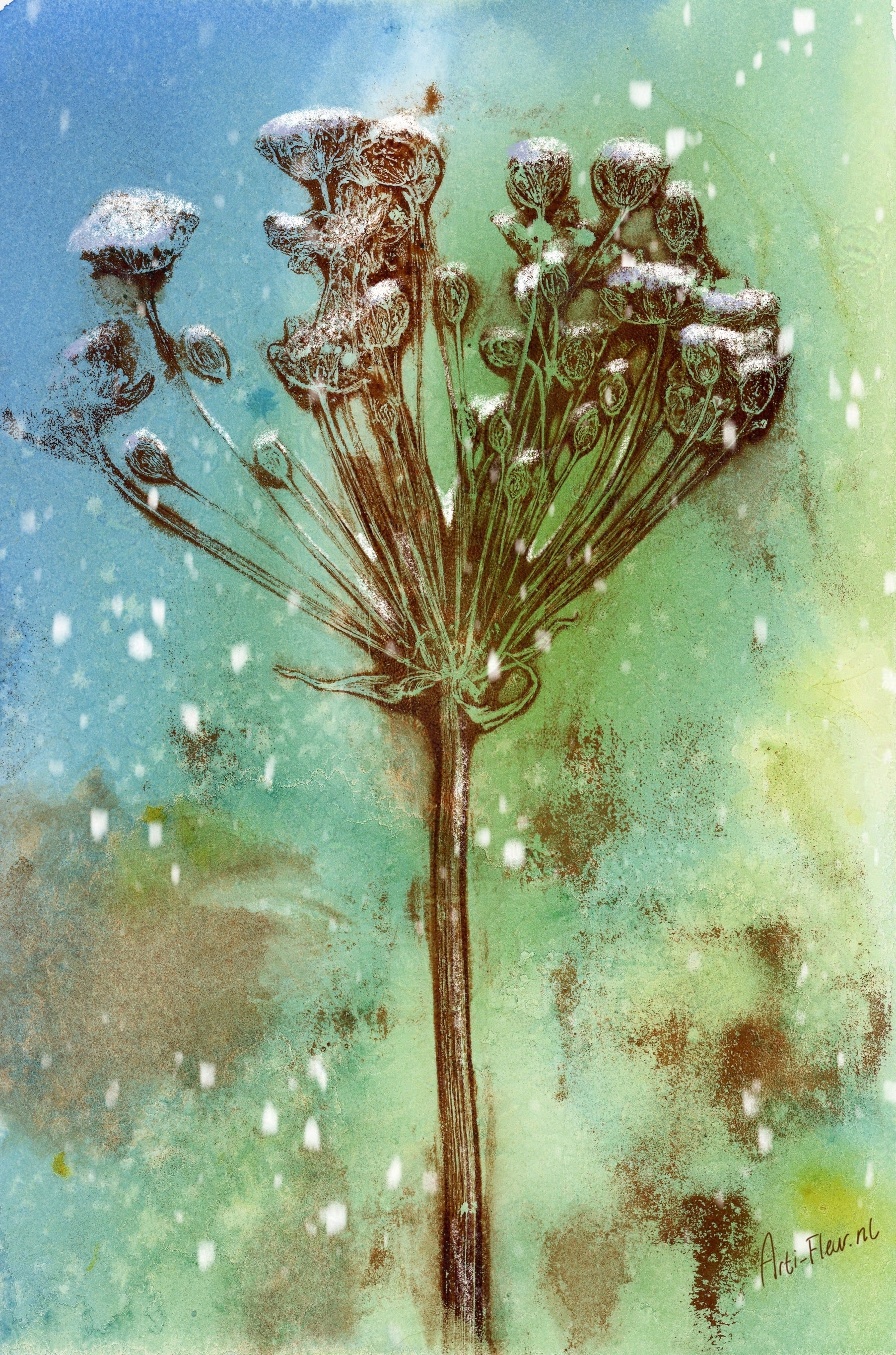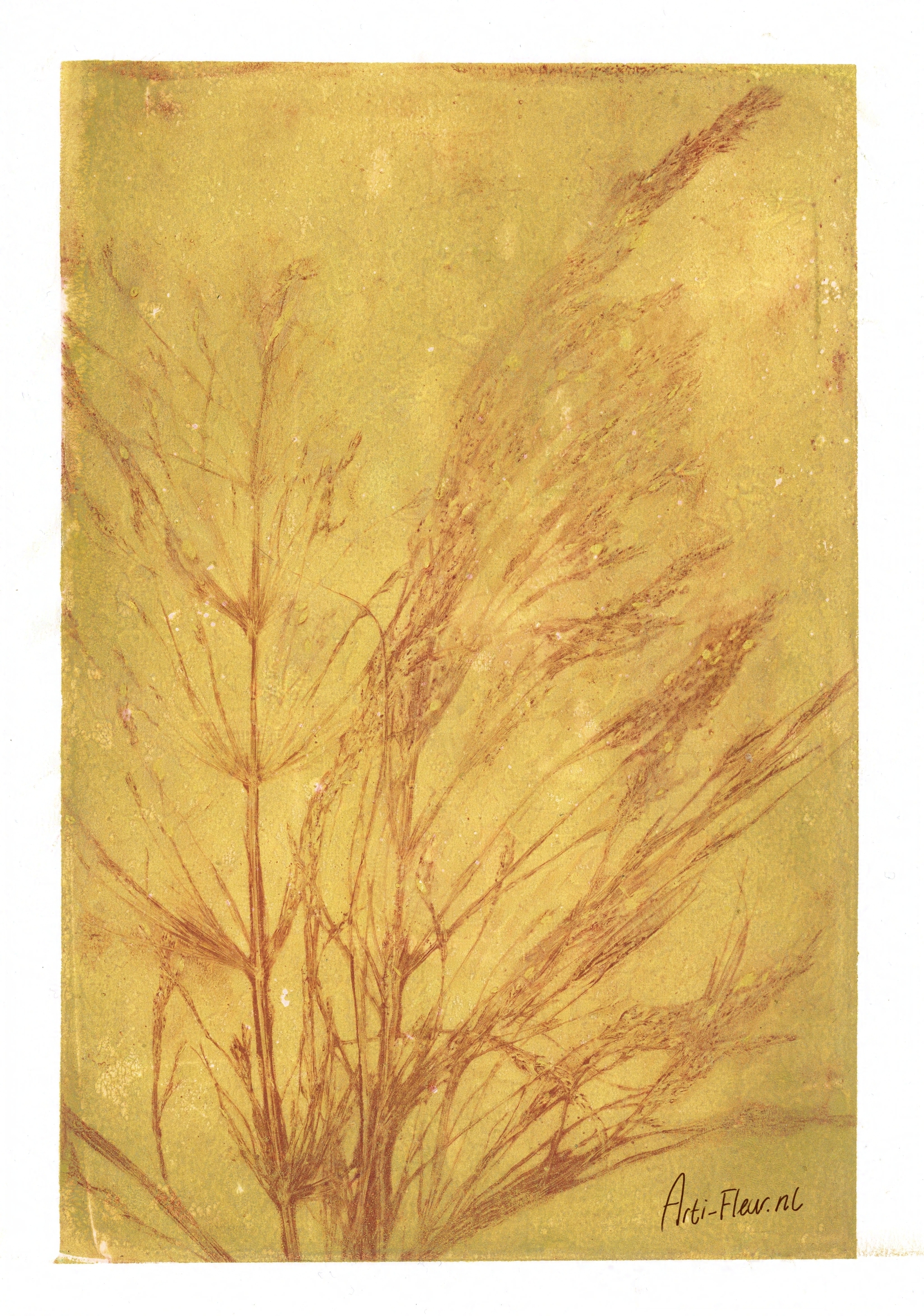 Three years ago, in addition to my illustrative work, I also started to make a lot of art with nature as a great inspiration but also as a medium in the work. I make stamps in the shape of plants, but I also make monoprints with prints of plants themselves for example. I often finish such a work by drawing or painting in it.